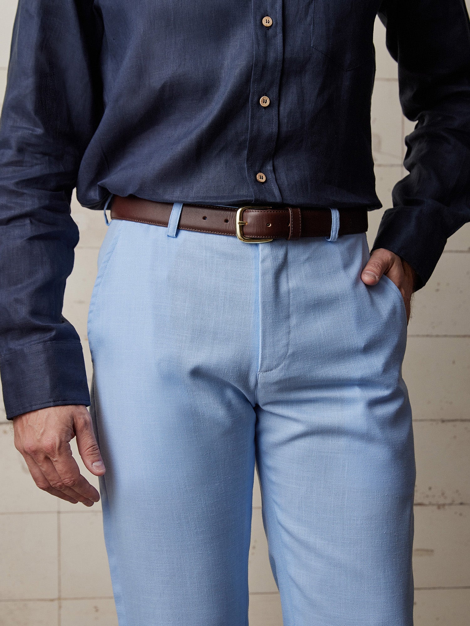 These Trousers are cut as refined linen slacks — elegant, elongated, and relaxed through the leg without ever drifting into holiday-pant territory. They’re light, breathable, and quietly elevated — trousers you can pair with the matching sportcoat, a linen shirt, a tee, or bare feet on a terrace at golden hour. Where other linen pants look crumpled, these look composed; where others feel casual, these read considered. The kind of trousers that tell the world you dressed with intention — without trying too hard.